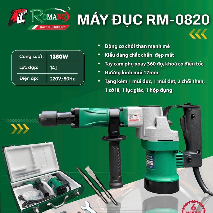 – Máy Đục Bê Tông Romano RM-0820 (1380W) là dòng máy đục bê tông. Hoạt động mạnh mẽ với công suất 1380W có thể được sử dụng để đục phá bê tông tảng lớn, tường gạch….