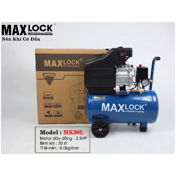 – Máy Nén Khí Có Dầu Maxlock 2.5Hp 30L MK30L được thiết kế nhỏ gọn với dung tích bình chứa 50L, hoạt động bền bỉ với giá thành phù hợp là lựa chọn số 1 cho khách hàng đang có nhu cầu sắm máy bơm hơi cho gia đình hay sử dụng trong tiệm sửa xe quy mô nhỏ.