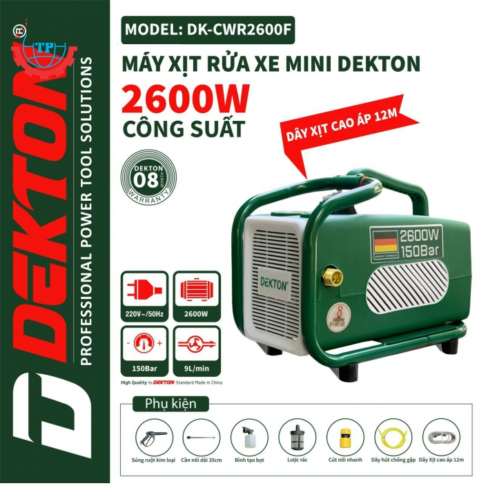 – Máy rửa xe gia đình 2600W Dekton DK-CWR2600F (chỉnh áp) hay còn gọi là máy rửa xe, máy xịt cao áp, máy bơm rửa xe với công xuất 2600W dùng để rửa xe hơi, xe gắn máy, vệ sinh máy lạnh, vệ sinh đường ống … hay rửa xe gia đình.